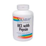 HCL com Pepsina 250mg da Solaray pode ser tomado diariamente com as refeições para promover uma boa digestão.