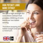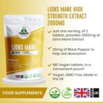 Apenas 2 comprimidos fornecem 2000 mg do cogumelo Lions Mane, juntamente com 20 mg de pimenta-do-reino para melhorar a absorção.