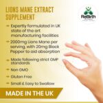 Juba de Leão com Pimenta Preta, Fabricado no Reino Unido, Poderoso Suplemento de Cogumelo, Rebirth Wellness, 2000mg, 180 Comprimidos Veganos Fáceis de Engolir