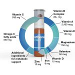 Vitamina C (como ácido ascórbico e ascorbato de sódio), ácidos graxos ômega-3 (de concentrado de óleo de peixe), cálcio (como lactato de cálcio);