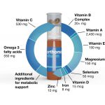 Vitamina C (como ácido ascórbico e ascorbato de sódio), ácidos graxos ômega-3 (de concentrado de óleo de peixe), magnésio (como carbonato de magnésio e magnésio;