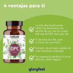 - Antioxidantes naturais: o OPC é conhecido pelos vários antioxidantes que contém. Assim como os flavonóides, que pertencem aos compostos secundários da planta, as catequinas, pertencentes aos antioxidantes, e ao resveratrol, que pertence aos polifenóis.