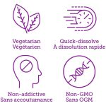 Livre de corantes artificiais, conservantes ou adoçantes; sem amido, trigo, glúten, fermento, soja, ovo, peixe, marisco, sal, nozes ou OGM. Adequado para vegetarianos.