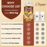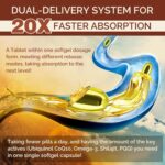 NÃO HÁ NECESSIDADE DE TOMAR MAIS CÁPSULAS. Nosso suplemento co q10 apresenta um inovador sistema revolucionário de dupla entrega - Encapsular um comprimido menor em uma única cápsula softgel, significa que você obterá duas cápsulas de forma para absorção dupla de ingredientes solúveis em óleo e não solúveis em óleo. Esta tecnologia atende às suas diferentes necessidades de forma de dosagem, tendo a quantidade dos principais ativos (Ubiquinol CoQ10, Shilajit, Ômega-3, PQQ) que você precisa em uma única cápsula softgel!